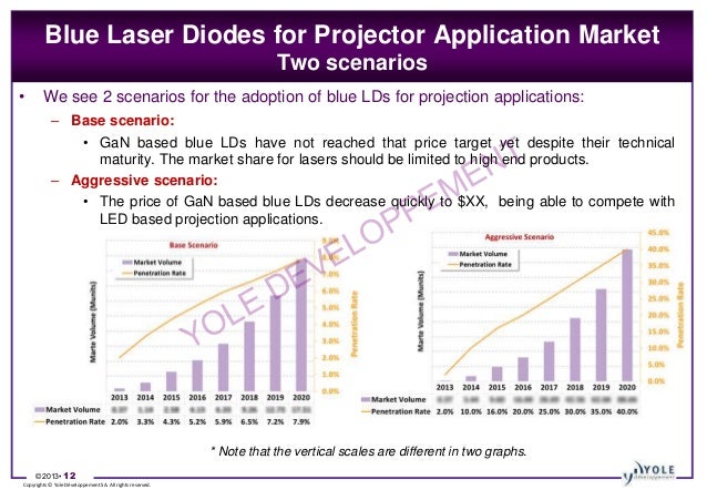- 12. Blue Laser Diodes for Projector Application Market Two scenarios • We see 2 scenarios for the adoption of blue LDs for projection applications: – Base scenario: • GaN based blue LDs have not reached that price target yet despite their technical maturity. The market share for lasers should be limited to high end products. – Aggressive scenario: • The price of GaN based blue LDs decrease quickly to $XX, being able to compete with LED based projection applications. NT E LE O E D EM PP LO VE Y * Note that the vertical scales are different in two graphs.