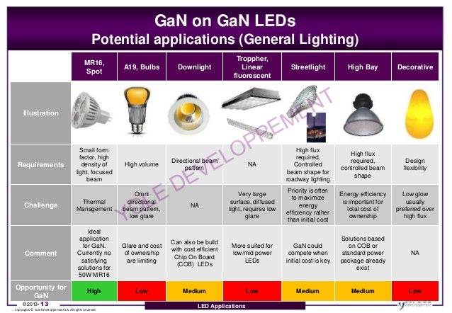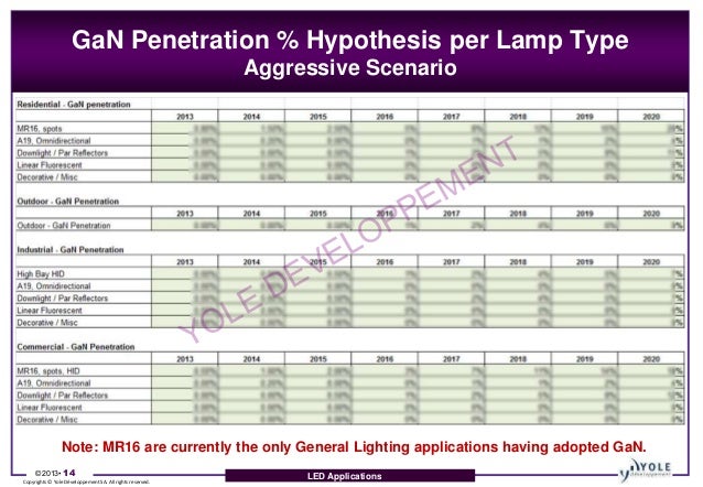 - 13. GaN on GaN LEDs Potential applications (General Lighting) MR16, Spot A19, Bulbs Downlight Small form factor, high density of light, focused beam High volume Challenge Thermal Management Omni directional beam pattern, low glare Comment Ideal application for GaN. Currently no satisfying solutions for 50W MR16 Opportunity for GaN High © 2013• Streetlight High Bay Decorative High flux required, controlled beam shape Design flexibility NT E Illustration Requirements Troppher, Linear fluorescent 13 Copyrights © Yole Développement SA. All rights reserved. LE YO EM PP LO VE Directional beam pattern NA High flux required, Controlled beam shape for roadway lighting NA Very large surface, diffused light, requires low glare Priority is often to maximize energy efficiency rather than initial cost Energy efficiency is important for total cost of ownership Low glow usually preferred over high flux NA Low E D Glare and cost of ownership are limiting Can also be build with cost efficient Chip On Board (COB) LEDs More suited for low/mid power LEDs GaN could compete when initial cost is key Solutions based on COB or standard power package already exist Low Medium Low Medium Medium LED Applications
