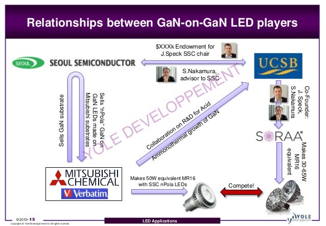 - 15. Relationships between GaN-on-GaN LED players $XXXk Endowment for J.Speck SSC chair NT E Y Makes 50W equivalent MR16 with SSC nPola LEDs © 2013• 15 Copyrights © Yole Développement SA. All rights reserved. Makes 30-65W MR16 equivalent LE O E D EM PP LO VE LED Applications Co-Founder: J. Speck, S.Nakamura Sells “nPola” GaN on GaN LEDs made on Mitsubishi substrates Sells GaN substrate S.Nakamura, advisor to SSC Compete!