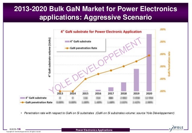 - 16. 2013-2020 Bulk GaN Market for Power Electronics applications: Aggressive Scenario NT E LE O E D EM PP LO VE Y • Penetration rate with respect to GaN on Si substrates (GaN on Si substrates volume: source Yole Développement)