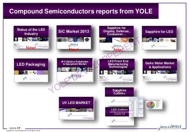 - 17. Compound Semiconductors reports from YOLE Status of the LED Industry Sapphire for Display, Defense, Consumer… SiC Market New! New! III-V Epitaxy Substrates & Equipment Market LED Packaging LE O E D Y UV LED MARKET © 2013• 17 Copyrights © Yole Développement SA. All rights reserved. NT E EM PP LO VE New! LED Front End Manufacturing Technologies Sapphire CoSim+ Sapphire for LED GaAs Wafer Market & Applications