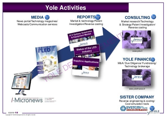 - 18. Yole Activities MEDIA REPORTS CONSULTING News portal/Technology magazines/ Webcasts/Communication services Market & technology/Patent Investigation/Reverse costing Market research/Technology & Strategy/Patent Investigation/ Reverse costing NT E LE O E D EM PP LO VE www.yole.fr YOLE FINANCE M&A/ Due Diligence/ Fundraising/ Technology brokerage Y www.yolefinance.fr SISTER COMPANY Reverse engineering & costing/ Cost simulation tools