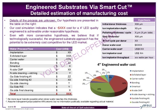 - 9. Engineered Substrates Via Smart Cut™ Detailed estimation of manufacturing cost • Details of the process are unknown. Our hypothesis are presented in the table on the right: Our cost simulation indicates that a ~$XXX cost for a 4” LED quality engineered is achievable under reasonable hypothesis. Even with more conservative hypothesis, we believe that if technologically successful, the engineered substrate approach has the potential to be extremely cost competitive for the LED market. Hypothesis • Wafer Process Flow Implantation Exfoliated layer Carrier wafer Bonding Smartcut N side CMP N side cleaning + etching Ga Side finishing #1 Ga side finishing #2 Ga side cleaning Ga Side RIE Ga side final cleaning Total 1: 2: Y LE O Ion implantation depth X0 µm Polishing thickness / cycle X µm (X µm /side) Stop thickness1 X00 µm # of cycle per donor XX $XXXX Carrier wafer cost2 US$XXX Ion implanter cost US$ Xm Ion implanter throughput xxx wafer per hour NT E EM PP LO VE Cost (US$) $ XX $ XXX $ YYY $ ZZ $ X $ XX $ Y $ ZZ $ XX $ T $ Y $ X $ XXX E D X00 µm Donor wafer cost • Initial donor thickness 4’’ Engineered wafer cost No more layer transfer possible when donor wafer reaches this thickness. Assume transparent polycrystaline AlN ceramic but no information publically available regarding actual material.