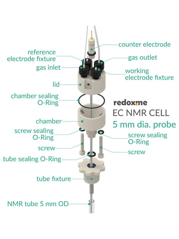The EC NMR cell elements are constructed with the following materials: a) Metallic - Tantalum, Silver, Platinum, Copper, Aluminum, Gold, Brass, and b) Non-metallic - PTFE, PEEK, FEP, FFKM, NMR glass (tube), Nylon, and PVC. The EC cell compartment is made of materials that are inert to the sample (glass and PEEK). It well fits aqueous (FKM O-Rings) and organic solvent (FFKM O-Rings) electrolyte requirements. The construction is gas-tight and can be used when the removal and exclusion of contaminants such as oxygen and water is required by bubbling of an inert gas through the electrolyte.