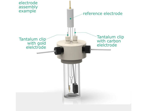 In this reactor, a solid anode (positive) and cathode (negative) are installed in Tantalum clips. If 3-electrode setup is required, the reference electrode is mounted in the reactor lid. Such electrode assembly is introduced into a solution containing the substrate and a supporting electrolyte, in order to carry the current through the cell.