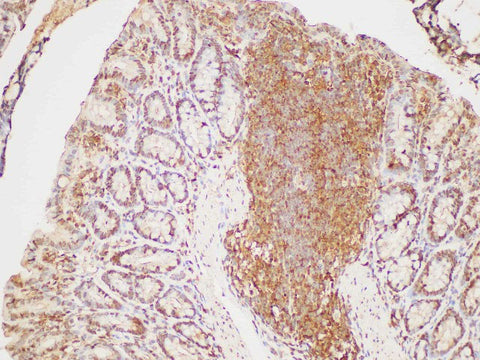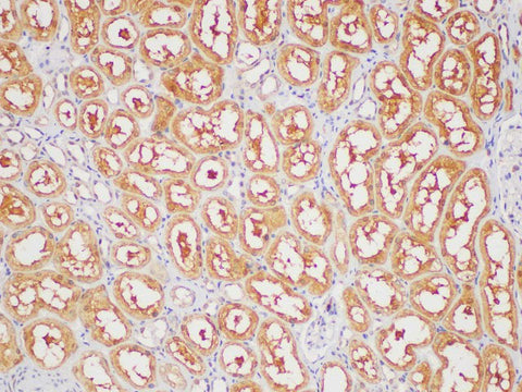 Glyceraldehyde-3-phosphate dehydrogenase (GAPDH) catalyzes the phosphorylation of glyceraldehyde-3-phosphate during glycolysis. GAPDH participates in nuclear events including transcription, binding RNA, RNA transportation, DNA replication, DNA repair and apoptosis. Being stably and constitutively expressed at high levels in most tissues and cells, GAPDH is considered a housekeeping protein. It was widely used as a control for RT-PCR and also loading control in electrophoresis and Western blotting. GAPDH is normally expressed in cellular cytoplasm or membrane, but can occasionally translocate to the nucleus post modification such as S-nitrosylation.
