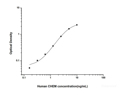This ELISA kit uses the Sandwich-ELISA principle. The micro ELISA plate provided in this kit has been pre-coated with an antibody specific to Human CHEM. Standards or samples are added to the micro ELISA plate wells and combined with the specific antibody. Then a biotinylated detection antibody specific for Human CHEM and Avidin-Horseradish Peroxidase (HRP) conjugate are added successively to each micro plate well and incubated. Free components are washed away. The substrate solution is added to each well. Only those wells that contain Human CHEM, biotinylated detection antibody and Avidin-HRP conjugate will appear blue in color. The enzyme-substrate reaction is terminated by the addition of stop solution and the color turns yellow. The optical density (OD) is measured spectrophotometrically at a wavelength of 450 nm ± 2 nm. The OD value is proportional to the concentration of Human CHEM. You can calculate the concentration of Human CHEM in the samples by comparing the OD of the samples to the standard curve.