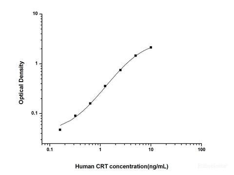 This ELISA kit uses the Sandwich-ELISA principle. The micro ELISA plate provided in this kit has been pre-coated with an antibody specific to Human CRT. Standards or samples are added to the micro ELISA plate wells and combined with the specific antibody. Then a biotinylated detection antibody specific for Human CRT and Avidin-Horseradish Peroxidase (HRP) conjugate are added successively to each micro plate well and incubated. Free components are washed away. The substrate solution is added to each well. Only those wells that contain Human CRT, biotinylated detection antibody and Avidin-HRP conjugate will appear blue in color. The enzyme-substrate reaction is terminated by the addition of stop solution and the color turns yellow. The optical density (OD) is measured spectrophotometrically at a wavelength of 450 nm ± 2 nm. The OD value is proportional to the concentration of Human CRT. You can calculate the concentration of Human CRT in the samples by comparing the OD of the samples to the standard curve.
