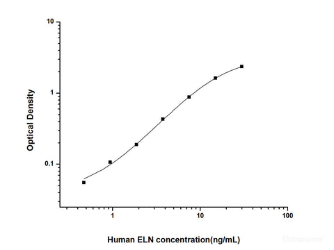 This ELISA kit uses the Sandwich-ELISA principle. The micro ELISA plate provided in this kit has been pre-coated with an antibody specific to Human ELN. Standards or samples are added to the micro ELISA plate wells and combined with the specific antibody. Then a biotinylated detection antibody specific for Human ELN and Avidin-Horseradish Peroxidase (HRP) conjugate are added successively to each micro plate well and incubated. Free components are washed away. The substrate solution is added to each well. Only those wells that contain Human ELN, biotinylated detection antibody and Avidin-HRP conjugate will appear blue in color. The enzyme-substrate reaction is terminated by the addition of stop solution and the color turns yellow. The optical density (OD) is measured spectrophotometrically at a wavelength of 450 nm ± 2 nm. The OD value is proportional to the concentration of Human ELN. You can calculate the concentration of Human ELN in the samples by comparing the OD of the samples to the standard curve.