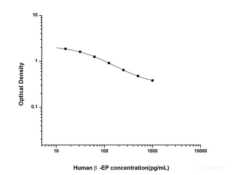This ELISA kit uses the Competitive-ELISA principle. The micro ELISA plate provided in this kit has been pre-coated with β-EP. During the reaction, β-EP in the sample or standard competes with a fixed amount of β-EP on the solid phase supporter for sites on the Biotinylated Detection Ab specific to β-EP. Excess conjugate and unbound sample or standard are washed away, and Avidin-Horseradish Peroxidase (HRP) conjugate are added to each micro plate well and incubated. Then a TMB substrate solution is added to each well. The enzyme-substrate reaction is terminated by the addition of stop solution and the color turns from blue to yellow. The optical density (OD) is measured spectrophotometrically at a wavelength of 450 nm ± 2 nm. The concentration of β-EP in tested samples can be calculated by comparing the OD of the samples to the standard curve.
