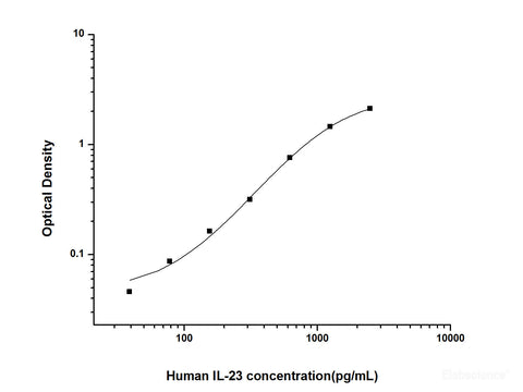 This ELISA kit uses the Sandwich-ELISA principle. The micro ELISA plate provided in this kit has been pre-coated with an antibody specific to Human IL-23. Standards or samples are added to the micro ELISA plate wells and combined with the specific antibody. Then a biotinylated detection antibody specific for Human IL-23 and Avidin-Horseradish Peroxidase (HRP) conjugate are added successively to each micro plate well and incubated. Free components are washed away. The substrate solution is added to each well. Only those wells that contain Human IL-23, biotinylated detection antibody and Avidin-HRP conjugate will appear blue in color. The enzyme-substrate reaction is terminated by the addition of stop solution and the color turns yellow. The optical density (OD) is measured spectrophotometrically at a wavelength of 450 nm ± 2 nm. The OD value is proportional to the concentration of Human IL-23. You can calculate the concentration of Human IL-23 in the samples by comparing the OD of the samples to the standard curve.