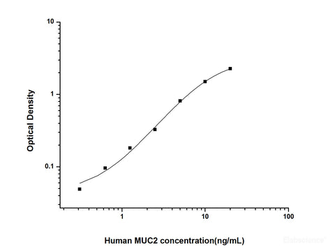 This ELISA kit uses the Sandwich-ELISA principle. The micro ELISA plate provided in this kit has been pre-coated with an antibody specific to Human MUC2. Standards or samples are added to the micro ELISA plate wells and combined with the specific antibody. Then a biotinylated detection antibody specific for Human MUC2 and Avidin-Horseradish Peroxidase (HRP) conjugate are added successively to each micro plate well and incubated. Free components are washed away. The substrate solution is added to each well. Only those wells that contain Human MUC2, biotinylated detection antibody and Avidin-HRP conjugate will appear blue in color. The enzyme-substrate reaction is terminated by the addition of stop solution and the color turns yellow. The optical density (OD) is measured spectrophotometrically at a wavelength of 450 nm ± 2 nm. The OD value is proportional to the concentration of Human MUC2. You can calculate the concentration of Human MUC2 in the samples by comparing the OD of the samples to the standard curve.