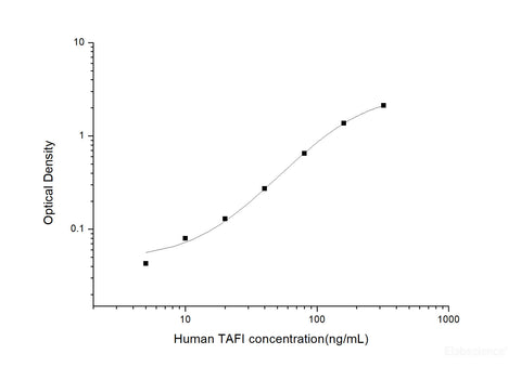This ELISA kit uses the Sandwich-ELISA principle. The micro ELISA plate provided in this kit has been pre-coated with an antibody specific to Human TAFI. Standards or samples are added to the micro ELISA plate wells and combined with the specific antibody. Then a biotinylated detection antibody specific for Human TAFI and Avidin-Horseradish Peroxidase (HRP) conjugate are added successively to each micro plate well and incubated. Free components are washed away. The substrate solution is added to each well. Only those wells that contain Human TAFI, biotinylated detection antibody and Avidin-HRP conjugate will appear blue in color. The enzyme-substrate reaction is terminated by the addition of stop solution and the color turns yellow. The optical density (OD) is measured spectrophotometrically at a wavelength of 450 nm ± 2 nm. The OD value is proportional to the concentration of Human TAFI. You can calculate the concentration of Human TAFI in the samples by comparing the OD of the samples to the standard curve.