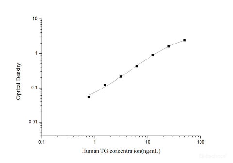 This ELISA kit uses the Sandwich-ELISA principle. The micro ELISA plate provided in this kit has been pre-coated with an antibody specific to Human TG. Standards or samples are added to the micro ELISA plate wells and combined with the specific antibody. Then a biotinylated detection antibody specific for Human TG and Avidin-Horseradish Peroxidase (HRP) conjugate are added successively to each micro plate well and incubated. Free components are washed away. The substrate solution is added to each well. Only those wells that contain Human TG, biotinylated detection antibody and Avidin-HRP conjugate will appear blue in color. The enzyme-substrate reaction is terminated by the addition of stop solution and the color turns yellow. The optical density (OD) is measured spectrophotometrically at a wavelength of 450 nm ± 2 nm. The OD value is proportional to the concentration of Human TG. You can calculate the concentration of Human TG in the samples by comparing the OD of the samples to the standard curve.