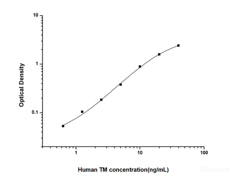 This ELISA kit uses the Sandwich-ELISA principle. The micro ELISA plate provided in this kit has been pre-coated with an antibody specific to Human TM. Standards or samples are added to the micro ELISA plate wells and combined with the specific antibody. Then a biotinylated detection antibody specific for Human TM and Avidin-Horseradish Peroxidase (HRP) conjugate are added successively to each micro plate well and incubated. Free components are washed away. The substrate solution is added to each well. Only those wells that contain Human TM, biotinylated detection antibody and Avidin-HRP conjugate will appear blue in color. The enzyme-substrate reaction is terminated by the addition of stop solution and the color turns yellow. The optical density (OD) is measured spectrophotometrically at a wavelength of 450 nm ± 2 nm. The OD value is proportional to the concentration of Human TM. You can calculate the concentration of Human TM in the samples by comparing the OD of the samples to the standard curve.