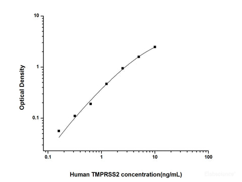This ELISA kit uses the Sandwich-ELISA principle. The micro ELISA plate provided in this kit has been pre-coated with an antibody specific to Human TMPRSS2. Standards or samples are added to the micro ELISA plate wells and combined with the specific antibody. Then a biotinylated detection antibody specific for Human TMPRSS2 and Avidin-Horseradish Peroxidase (HRP) conjugate are added successively to each micro plate well and incubated. Free components are washed away. The substrate solution is added to each well. Only those wells that contain Human TMPRSS2, biotinylated detection antibody and Avidin-HRP conjugate will appear blue in color. The enzyme-substrate reaction is terminated by the addition of stop solution and the color turns yellow. The optical density (OD) is measured spectrophotometrically at a wavelength of 450 nm ± 2 nm. The OD value is proportional to the concentration of Human TMPRSS2. You can calculate the concentration of Human TMPRSS2 in the samples by comparing the OD of the samples to the standard curve.