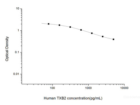 This ELISA kit uses the Competitive-ELISA principle. The micro ELISA plate provided in this kit has been pre-coated with TXB2. During the reaction, TXB2 in the sample or standard competes with a fixed amount of TXB2 on the solid phase supporter for sites on the Biotinylated Detection Ab specific to TXB2. Excess conjugate and unbound sample or standard are washed away, and Avidin-Horseradish Peroxidase (HRP) conjugate are added to each micro plate well and incubated. Then a TMB substrate solution is added to each well. The enzyme-substrate reaction is terminated by the addition of stop solution and the color turns from blue to yellow. The optical density (OD) is measured spectrophotometrically at a wavelength of 450 nm ± 2 nm. The concentration of TXB2 in tested samples can be calculated by comparing the OD of the samples to the standard curve.
