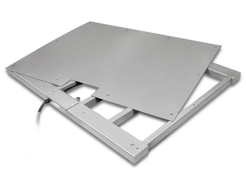 Stainless steel weighing bridge with screwed-on weighing plate (IP68) and stainless steel display device (IP65), verification optional.