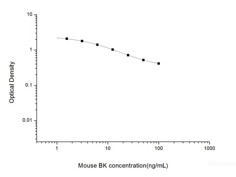 This ELISA kit uses the Competitive-ELISA principle. The micro ELISA plate provided in this kit has been pre-coated with BK. During the reaction, BK in the sample or standard competes with a fixed amount of BK on the solid phase supporter for sites on the Biotinylated Detection Ab specific to BK. Excess conjugate and unbound sample or standard are washed away, and Avidin-Horseradish Peroxidase (HRP) conjugate are added to each micro plate well and incubated. Then a TMB substrate solution is added to each well. The enzyme-substrate reaction is terminated by the addition of stop solution and the color turns from blue to yellow. The optical density (OD) is measured spectrophotometrically at a wavelength of 450 nm ± 2 nm. The concentration of BK in tested samples can be calculated by comparing the OD of the samples to the standard curve.