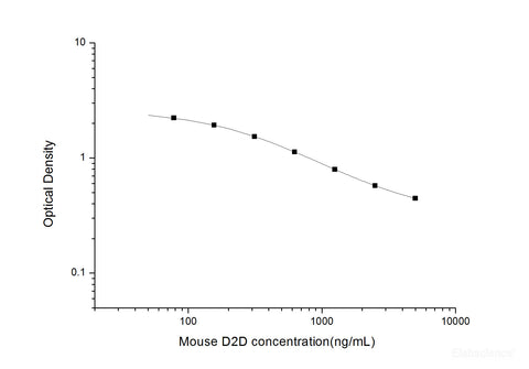 This ELISA kit uses the Competitive-ELISA principle. The micro ELISA plate provided in this kit has been pre-coated with an antibody specific to Mouse D2D. Standards or samples are added to the micro ELISA plate wells and combined with the specific antibody. Then a biotinylated detection antibody specific for Mouse D2D and Avidin-Horseradish Peroxidase (HRP) conjugate are added successively to each micro plate well and incubated. Free components are washed away. The substrate solution is added to each well. Only those wells that contain Mouse D2D, biotinylated detection antibody and Avidin-HRP conjugate will appear blue in color. The enzyme-substrate reaction is terminated by the addition of stop solution and the color turns yellow. The optical density (OD) is measured spectrophotometrically at a wavelength of 450 nm ± 2 nm. The OD value is proportional to the concentration of Mouse D2D. You can calculate the concentration of Mouse D2D in the samples by comparing the OD of the samples to the standard curve.