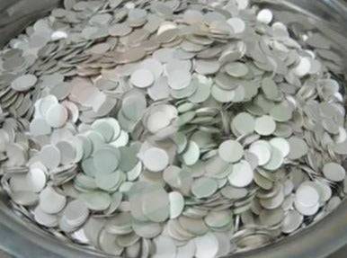 100g battery grade lithium chips with 16 mm Diameter and 0.25mm Thick for battery research. These lithium chips are widely used in Li ion and Li-Metal battery research.  Lithium is very reactive in air. Never open the can in air. Can with lithium chips must be opened inside a glove box with Argon Gas and moisture less than 2%RH.