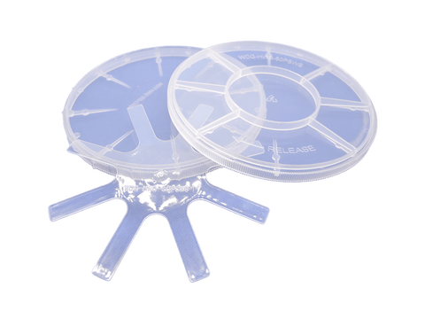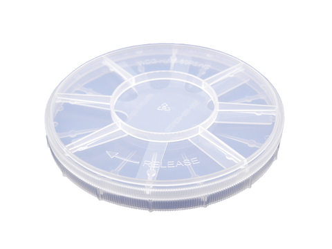 Each Single Wafer Carrier Case includes a spider ring (pressure retention), lid and the base case. The wafer carriers have a conical base to support the wafers at the edges only. The wafers are held in place and secured by a spider spring and locking lid.