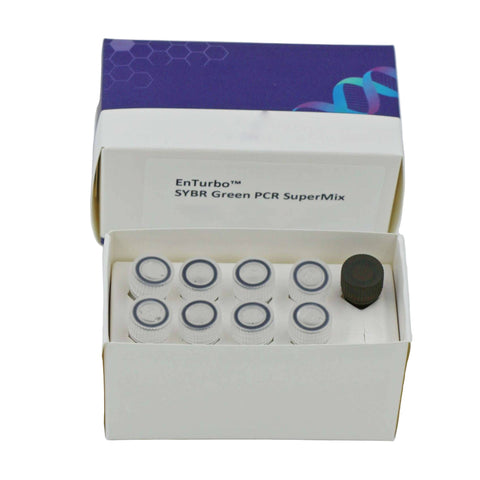 | Introduction | EnTurbo™ SYBR Green PCR SuperMix is an optimized 2x real-time PCR master mix containing HotStarTaq DNA Polymerase, SYBR Green® fluorescent dye, dNTP and Mg2+. In addition, the balanced K+ and NH4+ ion ratios in the buffer promote specific primer annealing. To ensure a highly sensitive and specific PCR reaction, the reaction can be initiated by simply adding the primer and cDNA template to the ready-to-use PCR master mix. The unique PCR buffer ensures sensitive qPCR on all real-time PCR instruments without optimization. |