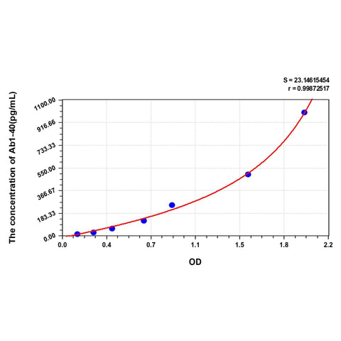 | Test principle | The test principle applied in this kit is Sandwich enzyme immunoassay. The microtiter plate provided in this kit has been pre-coated with an antibody specific to Human Ab1-40. Standards or samples are added to the appropriate microtiter plate wells then with a biotin-conjugated antibody specific to Human Ab1-40. Next, Avidin conjugated to Horseradish Peroxidase (HRP) is added to each microplate well and incubated. After TMB substrate solution is added, only those wells that contain Human Ab1-40, biotin-conjugated antibody and enzyme-conjugated Avidin will exhibit a change in color. The enzyme-substrate reaction is terminated by the addition of sulphuric acid solution and the color change is measured spectrophotometrically at a wavelength of 450nm ± 10nm. The concentration of Human Ab1-40 in the samples is then determined by comparing the OD of the samples to the standard curve. |