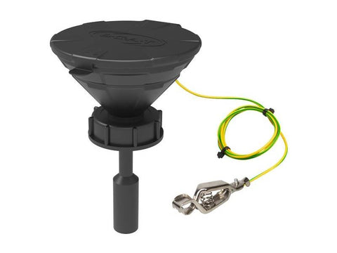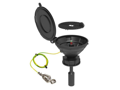 Funnel with lid "MARCO", V2.0, S70/71, PE-HD electrostatic conductive, with level control, length of the floater = 150 mm, removable sieve and earthing cable, funnel-diameter 157 mm OD (140mm ID)