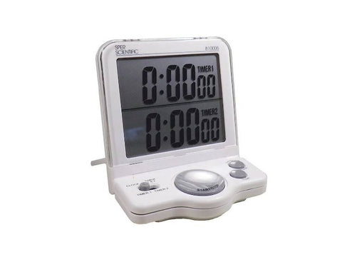 Can be easily read from across a room. Simultaneously displays either one count up channel and a clock, or two count down channels. All channels have a range of 24 hours with 1 second resolution. Also indicates how much time has elapsed after a count down alarm sounds and conveniently recalls the last timer setting for reuse. White case has extra-large start/stop button and a loud alarm.