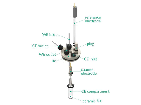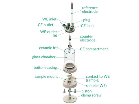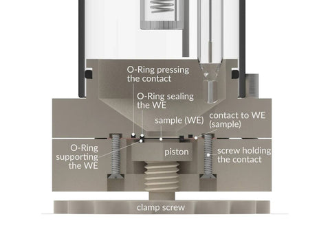 A customization for other substrates sizes/shapes is available on request. The cell elements are constructed with materials that are inert to the sample (glass and PEEK). It well fits aqueous (FKM/EPDM O-Rings) and organic solvent (FFKM O-Rings) electrolyte requirements. The construction is gas-tight and can be used when the removal and exclusion of contaminants such as oxygen and water is required by bubbling of an inert gas through the electrolyte.