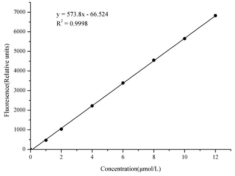 As the fluorescence value of the standard curve may vary according to the conditions of the actual assay performance (e.g. operator, pipetting technique or temperature effects), so the standard curve and data are provided as below for reference only