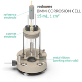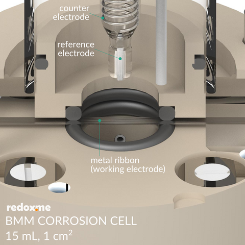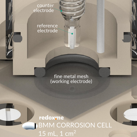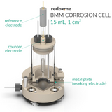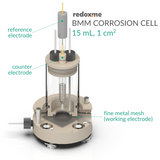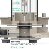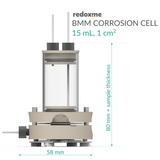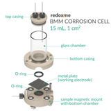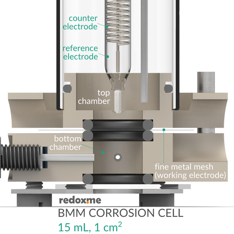 This is a stationary solution corrosion cell for EIS and conventional electrochemical measurements on: (a) thin metal film deposited on flat substrate, (b) metal plate, (c) metal mesh, (d) metal wire and (e) metal ribbon. The sample is installed from the bottom via magnetic or screw mount in between two chambers filled with electrolyte. In cases (a) and (b) bottom chamber is unused and stays dry. The counter or/and reference electrodes are mounted in a top casing (either 2-, or 3-electrode setup). The cell elements are constructed with materials that are inert to the sample (glass and PEEK). It well fits aqueous (FKM/EPDM O-Rings) and organic solvent (FFKM O-Rings) electrolyte requirements. The construction is gas-tight and can be used when the removal and exclusion of contaminants such as oxygen and water is required by bubbling of an inert gas through the electrolyte.