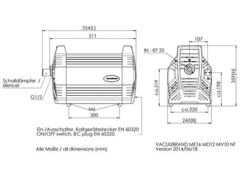 The MD 12 NT diaphragm pump is an especially powerful pump for oil-free evacuation and pumping of non aggressive gases. The three-stage design of this eight-cylinder pump provides the advantageous combination of very high pumping speed and excellent ultimate vacuum. The flow path consists of aluminium, stainless steel and carefully selected plastics to permit a wide range of applications. The fabric-reinforced double diaphragms are made of highly flexible FKM for extended operating life and high vacuum performance. Eight-cylinder NT pumps feature quiet operation, with smooth and easy-to-clean surfaces. Like all VACUUBRAND diaphragm pumps they operate absolutely oil-free and do not have any sliding components in the gas path. In normal operation they are completely free of abrasion. This eliminates most of the particulate impurities frequently generated inside of scroll or piston pumps. The MD 12 NT is an excellent choice for continuous, oil-free evacuation and pumping of non-aggressive gases especially for applications in physics and analytics. Due to the very good ultimate vacuum the MD 12 NT is often used as an alternative to rotary vane pumps, for example for vacuum ovens, for very quick and efficient degassing of viscous media, exhaust gas analytics and especially as backing pump for large turbomolecular drag pumps. The particularly high pumping speed enables the usage at bigger vacuum apparatus and with high gas throughput. The pump is extraordinarily silent and exhibits very low vibration making it an excellent choice on sensitive equipment such as electron microscopes. Back diffusion of oil or even oil back flow, e.g., into a high vacuum chamber is excluded due to its oil-free operation.