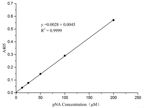 - The pNA (4-nitroaniline) is toxic to the human body. Please be careful during operating, and pay attention to avoid direct contact with the human body or inhalation. The pNA will solidify at a lower temperature and stick to the bottom, wall or cap of centrifuge tube. It can be used until it is completely melted in a water bath at 20~25°C for a moment.