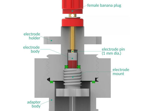 This fully customizable industrial electrode adapter is used to convert 6 mm dia. electrode to the required socket of another system. Moreover, the electrical connection is converted from 1 mm dia. pin to 4 mm dia. banana plug. The electrode which is not included in this product is an inset for that adapter. Typical electrodes are cup less Ag/AgCl 70 mm Reference Electrodes, Working Disc Electrodes and Graphite Counter Electrodes.