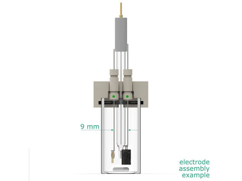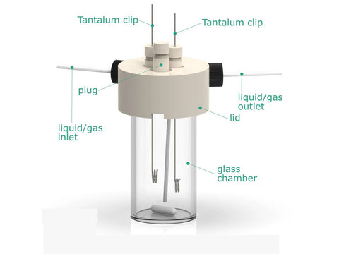 In this reactor, a solid anode (positive) and cathode (negative) are installed in Tantalum clips. If 3-electrode setup is required, the reference electrode is mounted in the reactor lid. Such electrode assembly is introduced into a solution containing the substrate and a supporting electrolyte, in order to carry the current through the cell.