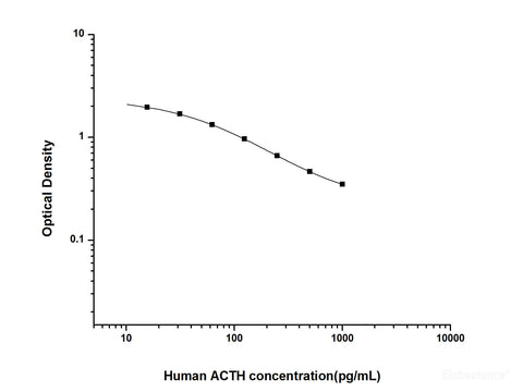 This ELISA kit uses the Competitive-ELISA principle. The micro ELISA plate provided in this kit has been pre-coated with ACTH. During the reaction, ACTH in the sample or standard competes with a fixed amount of ACTH on the solid phase supporter for sites on the Biotinylated Detection Ab specific to ACTH. Excess conjugate and unbound sample or standard are washed away, and Avidin-Horseradish Peroxidase (HRP) conjugate are added to each micro plate well and incubated. Then a TMB substrate solution is added to each well. The enzyme-substrate reaction is terminated by the addition of stop solution and the color turns from blue to yellow. The optical density (OD) is measured spectrophotometrically at a wavelength of 450 nm ± 2 nm. The concentration of ACTH in tested samples can be calculated by comparing the OD of the samples to the standard curve.