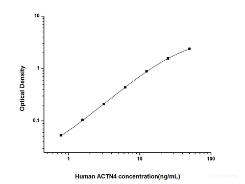 This ELISA kit uses the Sandwich-ELISA principle. The micro ELISA plate provided in this kit has been pre-coated with an antibody specific to Human ACTN4. Standards or samples are added to the micro ELISA plate wells and combined with the specific antibody. Then a biotinylated detection antibody specific for Human ACTN4 and Avidin-Horseradish Peroxidase (HRP) conjugate are added successively to each micro plate well and incubated. Free components are washed away. The substrate solution is added to each well. Only those wells that contain Human ACTN4, biotinylated detection antibody and Avidin-HRP conjugate will appear blue in color. The enzyme-substrate reaction is terminated by the addition of stop solution and the color turns yellow. The optical density (OD) is measured spectrophotometrically at a wavelength of 450 nm ± 2 nm. The OD value is proportional to the concentration of Human ACTN4. You can calculate the concentration of Human ACTN4 in the samples by comparing the OD of the samples to the standard curve.