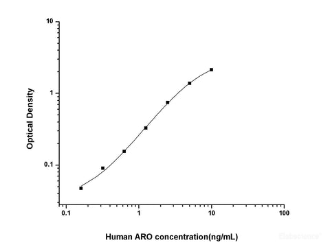 This ELISA kit uses the Sandwich-ELISA principle. The micro ELISA plate provided in this kit has been pre-coated with an antibody specific to Human ARO. Standards or samples are added to the micro ELISA plate wells and combined with the specific antibody. Then a biotinylated detection antibody specific for Human ARO and Avidin-Horseradish Peroxidase (HRP) conjugate are added successively to each micro plate well and incubated. Free components are washed away. The substrate solution is added to each well. Only those wells that contain Human ARO, biotinylated detection antibody and Avidin-HRP conjugate will appear blue in color. The enzyme-substrate reaction is terminated by the addition of stop solution and the color turns yellow. The optical density (OD) is measured spectrophotometrically at a wavelength of 450 nm ± 2 nm. The OD value is proportional to the concentration of Human ARO. You can calculate the concentration of Human ARO in the samples by comparing the OD of the samples to the standard curve.