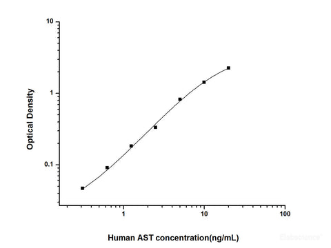 This ELISA kit uses the Sandwich-ELISA principle. The micro ELISA plate provided in this kit has been pre-coated with an antibody specific to Human AST. Standards or samples are added to the micro ELISA plate wells and combined with the specific antibody. Then a biotinylated detection antibody specific for Human AST and Avidin-Horseradish Peroxidase (HRP) conjugate are added successively to each micro plate well and incubated. Free components are washed away. The substrate solution is added to each well. Only those wells that contain Human AST, biotinylated detection antibody and Avidin-HRP conjugate will appear blue in color. The enzyme-substrate reaction is terminated by the addition of stop solution and the color turns yellow. The optical density (OD) is measured spectrophotometrically at a wavelength of 450 nm ± 2 nm. The OD value is proportional to the concentration of Human AST. You can calculate the concentration of Human AST in the samples by comparing the OD of the samples to the standard curve.