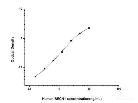 This ELISA kit uses the Sandwich-ELISA principle. The micro ELISA plate provided in this kit has been pre-coated with an antibody specific to Human BECN1. Standards or samples are added to the micro ELISA plate wells and combined with the specific antibody. Then a biotinylated detection antibody specific for Human BECN1 and Avidin-Horseradish Peroxidase (HRP) conjugate are added successively to each micro plate well and incubated. Free components are washed away. The substrate solution is added to each well. Only those wells that contain Human BECN1, biotinylated detection antibody and Avidin-HRP conjugate will appear blue in color. The enzyme-substrate reaction is terminated by the addition of stop solution and the color turns yellow. The optical density (OD) is measured spectrophotometrically at a wavelength of 450 nm ± 2 nm. The OD value is proportional to the concentration of Human BECN1. You can calculate the concentration of Human BECN1 in the samples by comparing the OD of the samples to the standard curve.