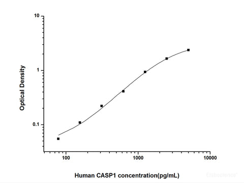 This ELISA kit uses the Sandwich-ELISA principle. The micro ELISA plate provided in this kit has been pre-coated with an antibody specific to Human CASP1. Standards or samples are added to the micro ELISA plate wells and combined with the specific antibody. Then a biotinylated detection antibody specific for Human CASP1 and Avidin-Horseradish Peroxidase (HRP) conjugate are added successively to each micro plate well and incubated. Free components are washed away. The substrate solution is added to each well. Only those wells that contain Human CASP1, biotinylated detection antibody and Avidin-HRP conjugate will appear blue in color. The enzyme-substrate reaction is terminated by the addition of stop solution and the color turns yellow. The optical density (OD) is measured spectrophotometrically at a wavelength of 450 nm ± 2 nm. The OD value is proportional to the concentration of Human CASP1. You can calculate the concentration of Human CASP1 in the samples by comparing the OD of the samples to the standard curve.