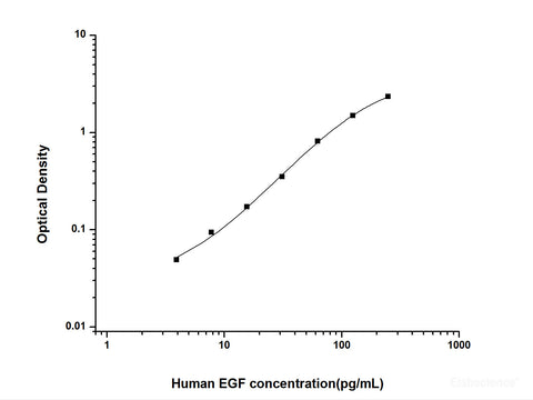 This ELISA kit uses the Sandwich-ELISA principle. The micro ELISA plate provided in this kit has been pre-coated with an antibody specific to Human EGF. Standards or samples are added to the micro ELISA plate wells and combined with the specific antibody. Then a biotinylated detection antibody specific for Human EGF and Avidin-Horseradish Peroxidase (HRP) conjugate are added successively to each micro plate well and incubated. Free components are washed away. The substrate solution is added to each well. Only those wells that contain Human EGF, biotinylated detection antibody and Avidin-HRP conjugate will appear blue in color. The enzyme-substrate reaction is terminated by the addition of stop solution and the color turns yellow. The optical density (OD) is measured spectrophotometrically at a wavelength of 450 nm ± 2 nm. The OD value is proportional to the concentration of Human EGF. You can calculate the concentration of Human EGF in the samples by comparing the OD of the samples to the standard curve.