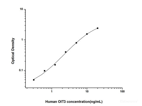 This ELISA kit uses the Sandwich-ELISA principle. The micro ELISA plate provided in this kit has been pre-coated with an antibody specific to Human OIT3. Standards or samples are added to the micro ELISA plate wells and combined with the specific antibody. Then a biotinylated detection antibody specific for Human OIT3 and Avidin-Horseradish Peroxidase (HRP) conjugate are added successively to each micro plate well and incubated. Free components are washed away. The substrate solution is added to each well. Only those wells that contain Human OIT3, biotinylated detection antibody and Avidin-HRP conjugate will appear blue in color. The enzyme-substrate reaction is terminated by the addition of stop solution and the color turns yellow. The optical density (OD) is measured spectrophotometrically at a wavelength of 450 nm ± 2 nm. The OD value is proportional to the concentration of Human OIT3. You can calculate the concentration of Human OIT3 in the samples by comparing the OD of the samples to the standard curve.