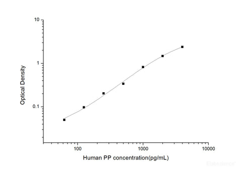 This ELISA kit uses the Sandwich-ELISA principle. The micro ELISA plate provided in this kit has been pre-coated with an antibody specific to Human PP. Standards or samples are added to the micro ELISA plate wells and combined with the specific antibody. Then a biotinylated detection antibody specific for Human PP and Avidin-Horseradish Peroxidase (HRP) conjugate are added successively to each micro plate well and incubated. Free components are washed away. The substrate solution is added to each well. Only those wells that contain Human PP, biotinylated detection antibody and Avidin-HRP conjugate will appear blue in color. The enzyme-substrate reaction is terminated by the addition of stop solution and the color turns yellow. The optical density (OD) is measured spectrophotometrically at a wavelength of 450 nm ± 2 nm. The OD value is proportional to the concentration of Human PP. You can calculate the concentration of Human PP in the samples by comparing the OD of the samples to the standard curve.