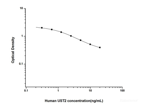 This ELISA kit uses the Competitive-ELISA principle. The micro ELISA plate provided in this kit has been pre-coated with UST2. During the reaction, UST2 in the sample or standard competes with a fixed amount of UST2 on the solid phase supporter for sites on the Biotinylated Detection Ab specific to UST2. Excess conjugate and unbound sample or standard are washed away, and Avidin-Horseradish Peroxidase (HRP) conjugate are added to each micro plate well and incubated. Then a TMB substrate solution is added to each well. The enzyme-substrate reaction is terminated by the addition of stop solution and the color turns from blue to yellow. The optical density (OD) is measured spectrophotometrically at a wavelength of 450 nm ± 2 nm. The concentration of UST2 in tested samples can be calculated by comparing the OD of the samples to the standard curve.