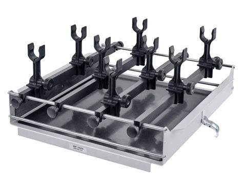 For shaking out, eluting, extracting, gassing out, dissolving, enriching, etc. Adjustment for the clamping rolls is infinitely variable, the set-up height can be changed by means of clamping devices. This attachment will hold 4 x 1,000 ml separating funnels.