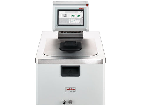 MAGIO MX-BC26 heating circulator with 26L bath tank and lid with 3 kW heating power to +300 °C. Large, color touchscreen UI with built-in help functions. For internal and external temperature applications. Includes Intelligent Cascade Control, self optimizing for optimum results with settings for band limit, limit setting, co-speed factor and control dynamics. An variable speed pressure / suction pump provides strong circulation for internal or external applications. A built-in cooling coil enables counter cooling with tap water. Barbed fittings for 8 and 12 mm ID tubing are included (pump connections M16x1 male). Includes Pt100 connection for external monitoring and control, electronically adjustable pressure/suction pump, RS232/RS285, USB and Ethernet ports with optional slot for analog communication (requires module 9900100). Modbus TCP/IP incorporated. Stakei port for external accessory control (solenoid valve, etc.). Class III (FL) according to DIN 12876-1.