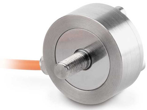 Miniature cylindrical load cell made from stainless steel.
